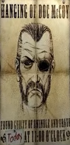 Making his way to the top of the cabin, Cooper witness the meeting between Carlos and the rest of the bandit leaders. El Diablos's representative asked him where his payment was. Just as stated before, he told them that he had been robbed and asked to speak with El Diablo himself. The representative humored the idea, by telling him that El Diablo, a.k.a. the devil, was already waiting for him in hell. As he said those words, the representative stabbed Carlos with a poisoned knife, killing him instantly as punishment for being unable to pay the tribute to El Diablo. The representative told the others to get Carlos' body out of there and to return to Grants. John leaves, somewhat disappointed that he didn't hear important information and merely witnessed Carlos' fate. https://www.youtube.com/watch?v=jI--sPIdPi4